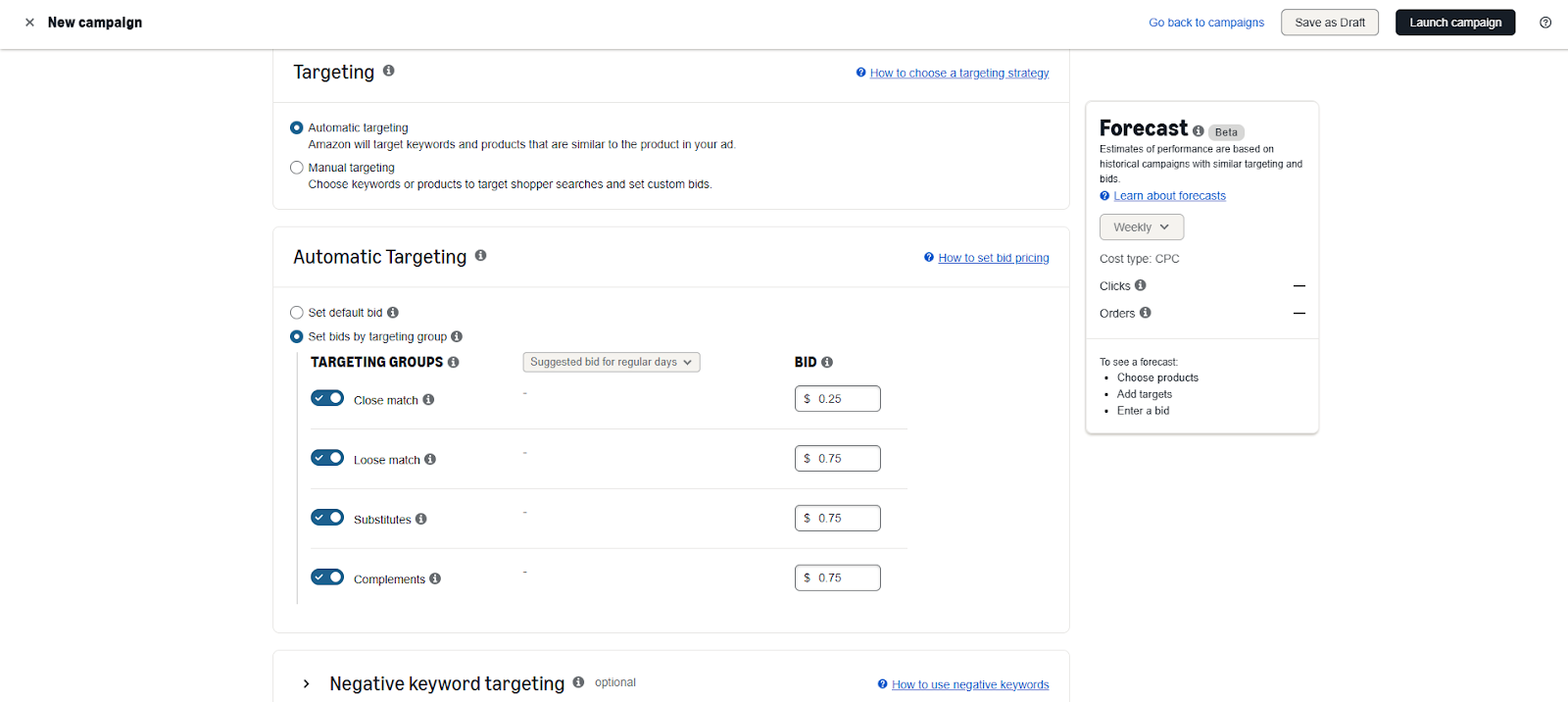 How to Create: Go to your Campaign Manager, then click on Create Campaign. Select Sponsored Product campaign type, and after adding the necessary information, add your products in the product section that you want to advertise. Then select Automatic Targeting, click on Set bids by targeting group, then Enable all Options under Targeting Groups. Add a low bid compared to the suggested average bids of your product line. It’s recommended to set bids around $0.20 and add some TOS and PP placements.