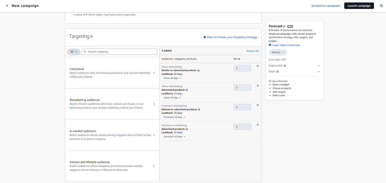 Execution: Setup Sponsored Display Retargeting campaigns, especially if you are selling some kind of consumable or a product which people buy frequently. You need to select options while creating a campaign.