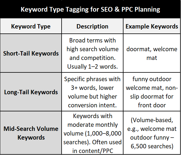 This tagging will help you later when you create campaigns or optimize listings, as you’ll easily be able to distinguish which keywords should go into which campaign type.